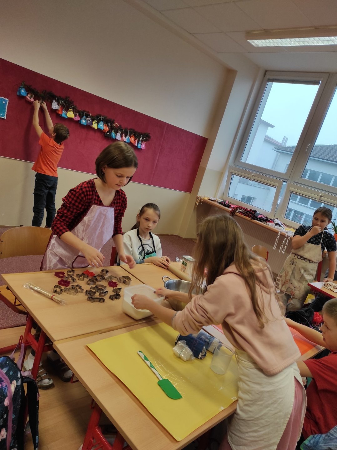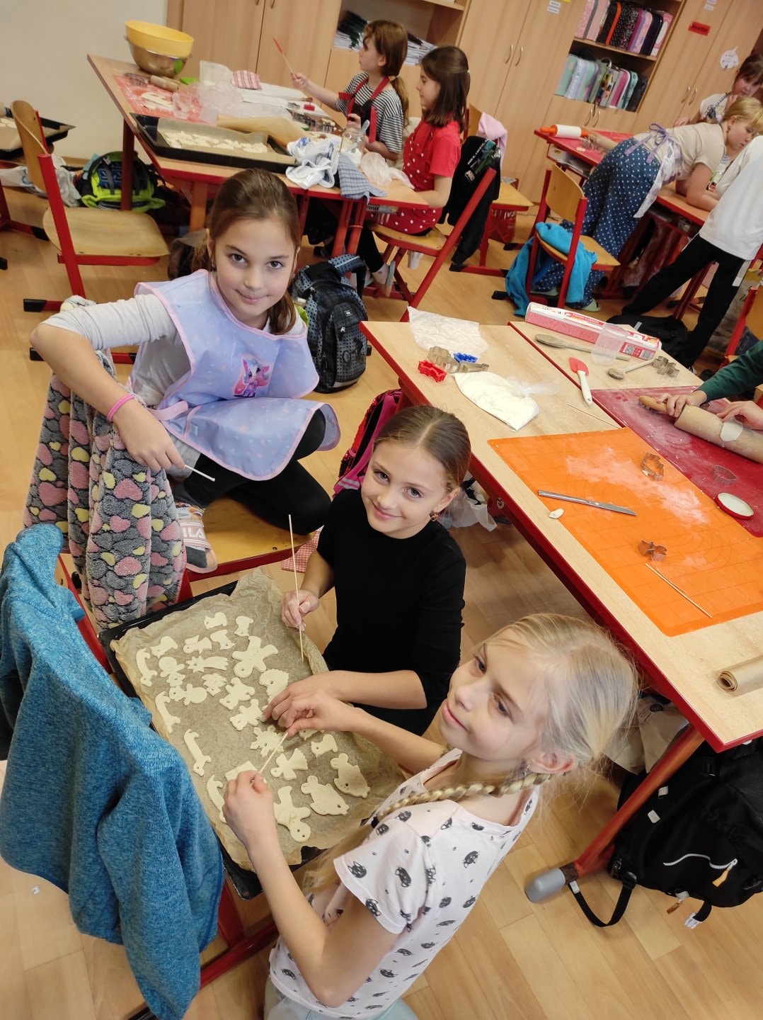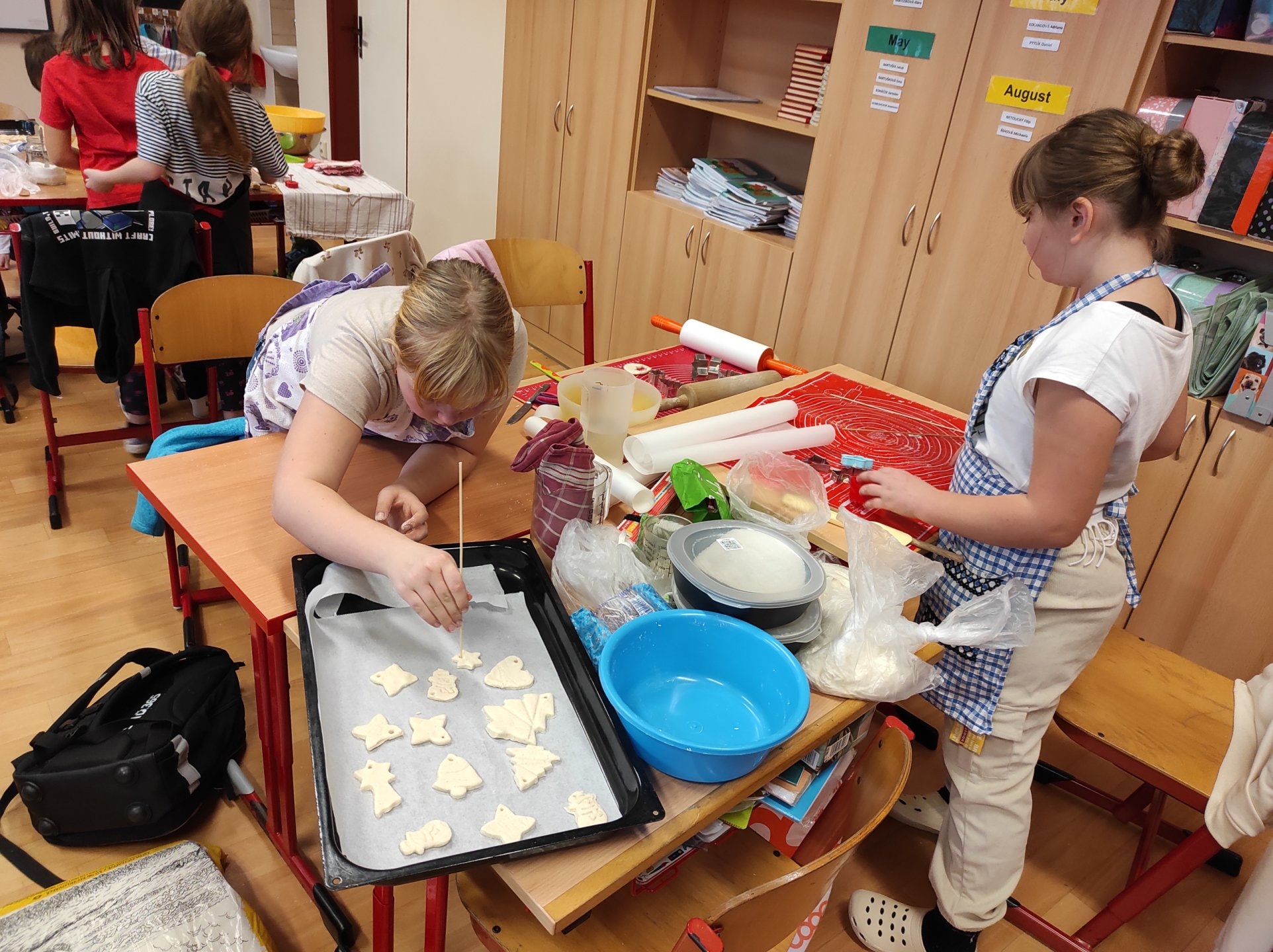 Ozdoby si děti vyrobily ze slaného těsta. Samy si těsto vypracovaly, vyválely a vykrajovaly různé tvary. Paní kuchařky nám vše upekla. Pak už stačilo jen nabarvit.