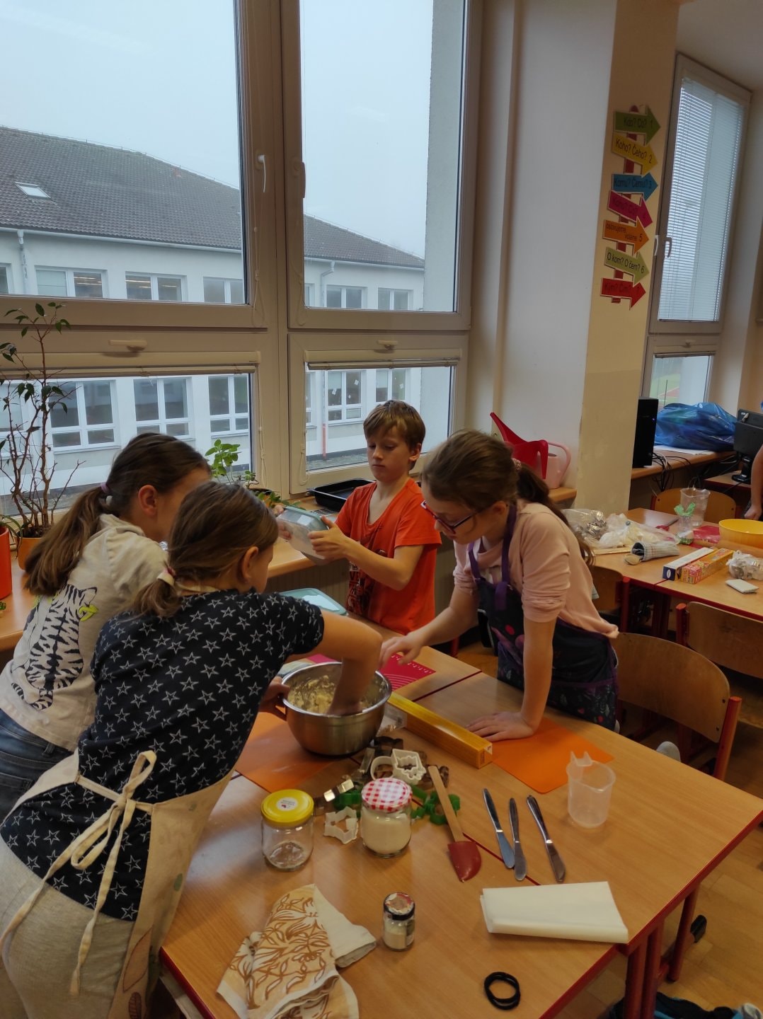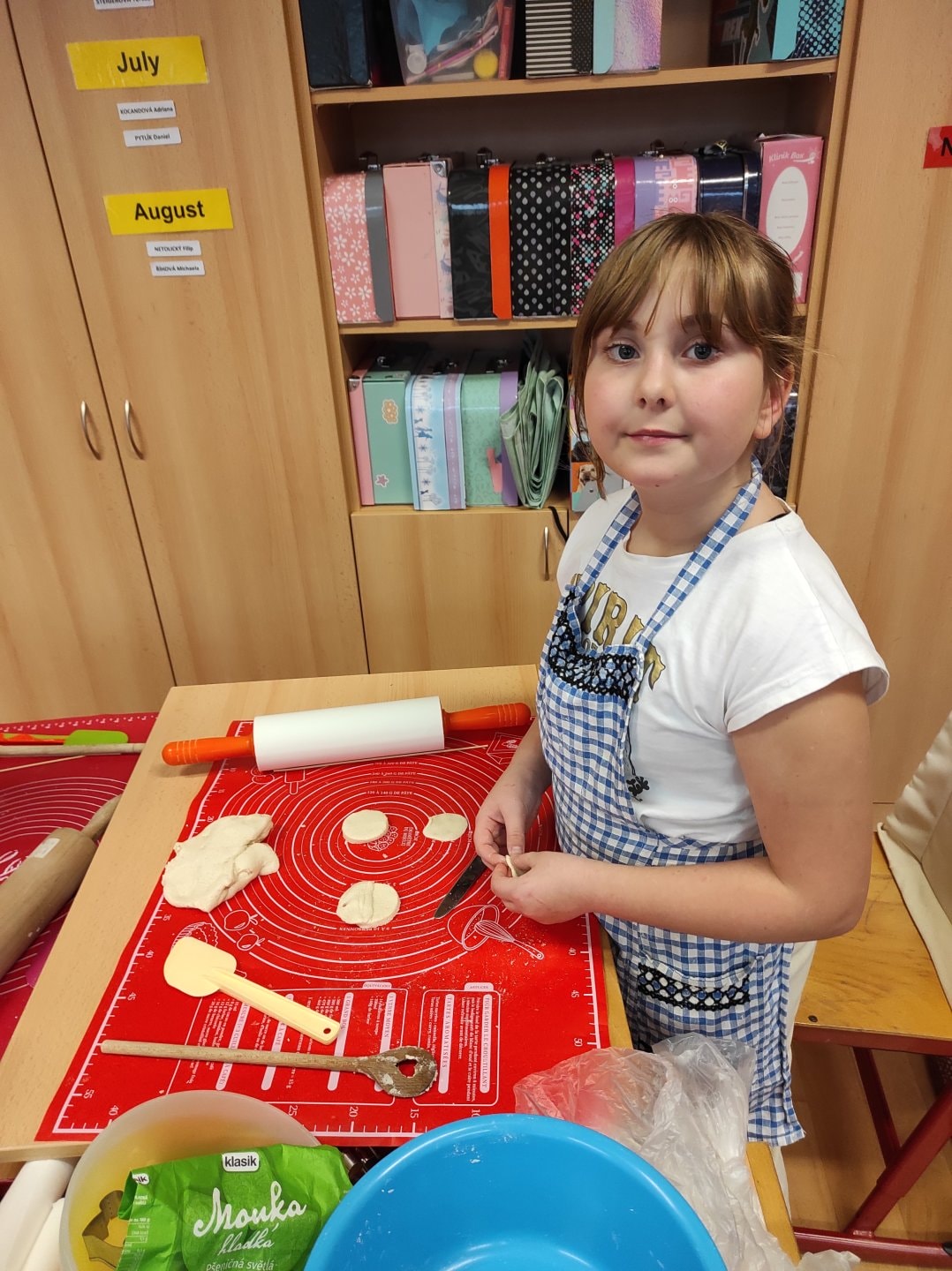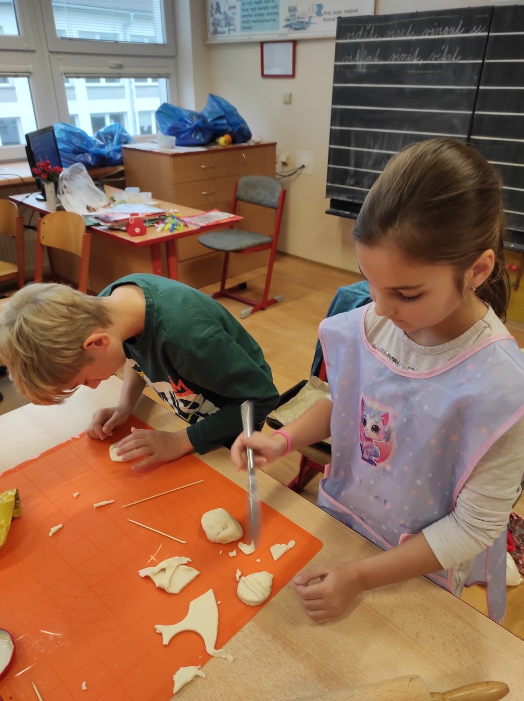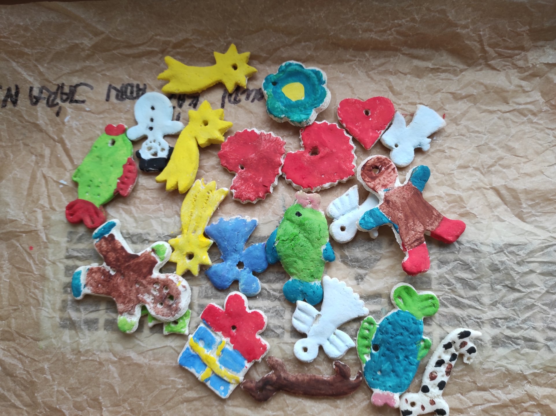 Ozdoby si děti vyrobily ze slaného těsta. Samy si těsto vypracovaly, vyválely a vykrajovaly různé tvary. Paní kuchařky nám vše upekla. Pak už stačilo jen nabarvit.